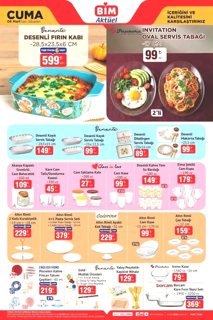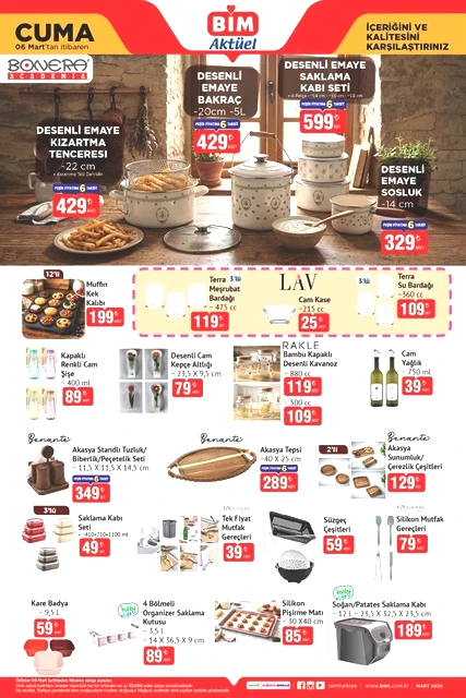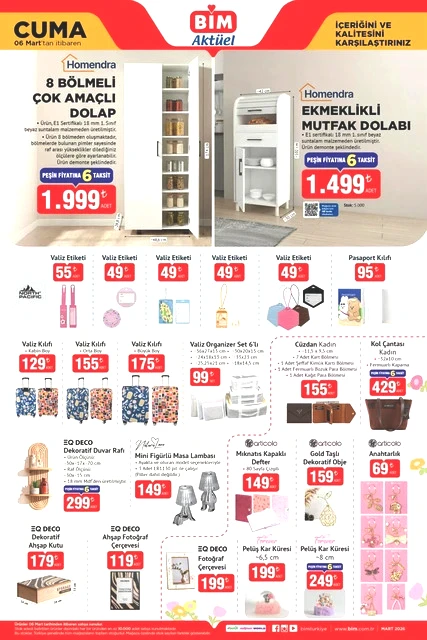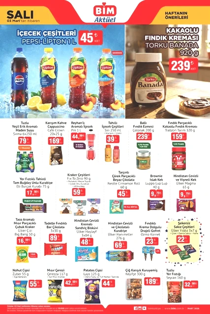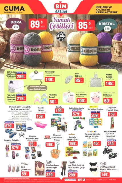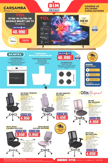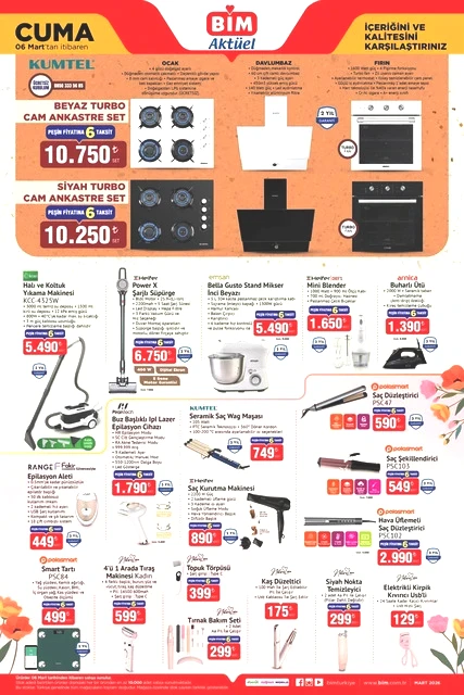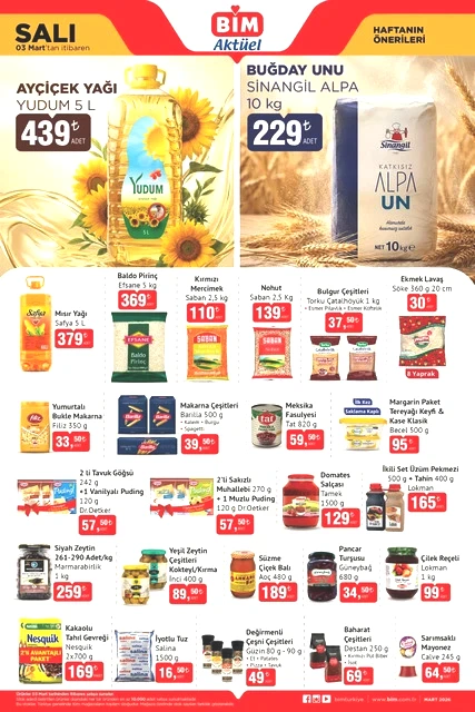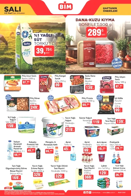 BİM marketlerinin 3-6 Mart tarihlerini kapsayan aktüel kataloğu yayımlandı. Mart ayının ilk yarısında, BİM mağazalarında çeşitli ürünler, uçuk fiyatlarla raflarda yerini alacak. Bunlar arasında dana ve kuzu kıyma, piliç pirzola, içli köfte, buğday unu gibi gıda ürünlerinin yanı sıra televizyonlar, ankastre setler, çalışma koltukları, halı ve koltuk yıkama makineleri, blenderlar, buharlı ütüler, epilasyon aletleri, saç şekillendiriciler, kaş düzelticiler, fırın kapları, kızartma tencereleri, ekmeklik mutfak dolapları ve valiz organizer setleri gibi birçok farklı ekipman da bulunuyor. Alışveriş severleri bekleyen bu ürünlerin ayrıntılarını ve BİM'in 3-6 Mart 2026 tarihli aktüel broşürüne göz atmak için yazımızı okumaya devam edin…
